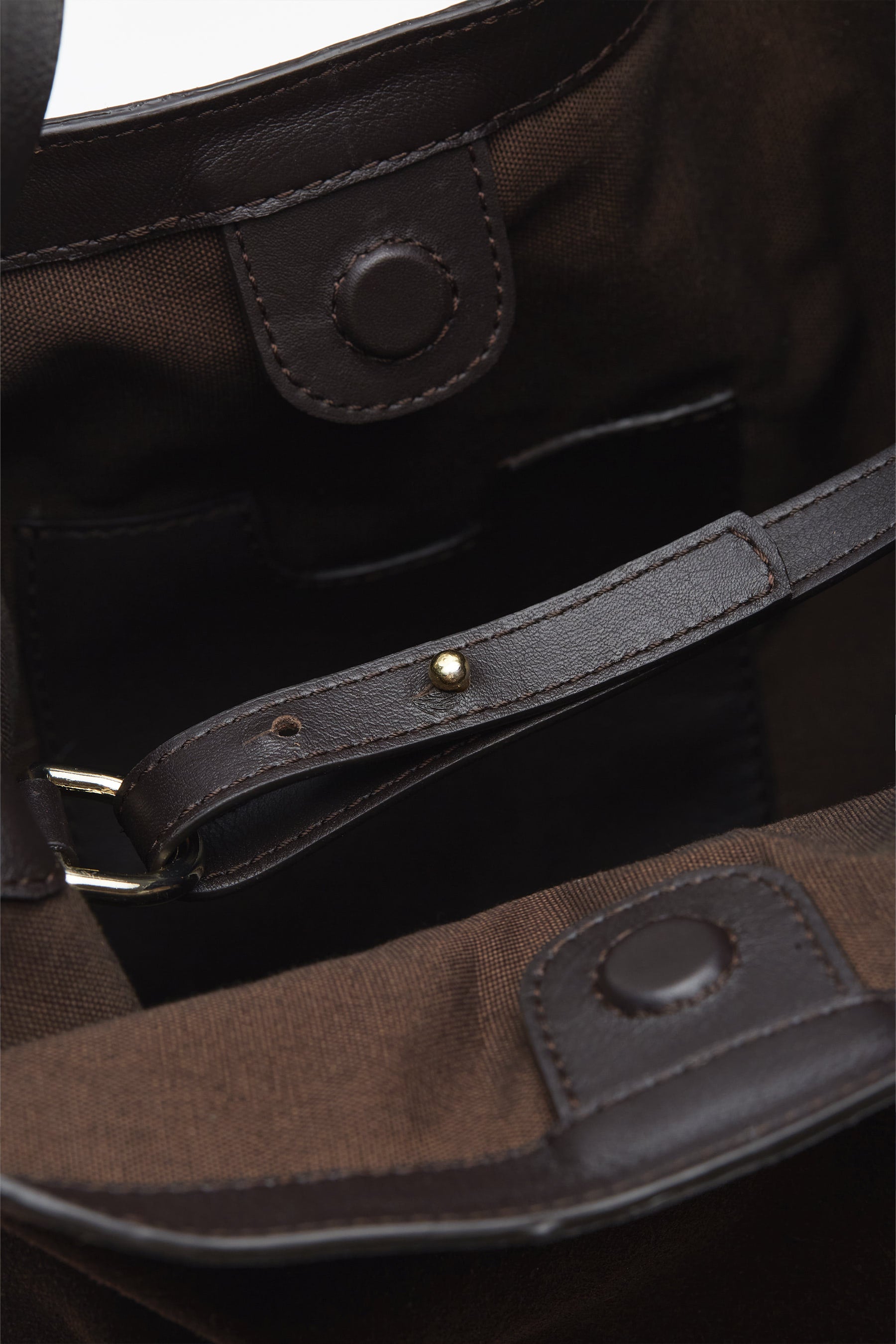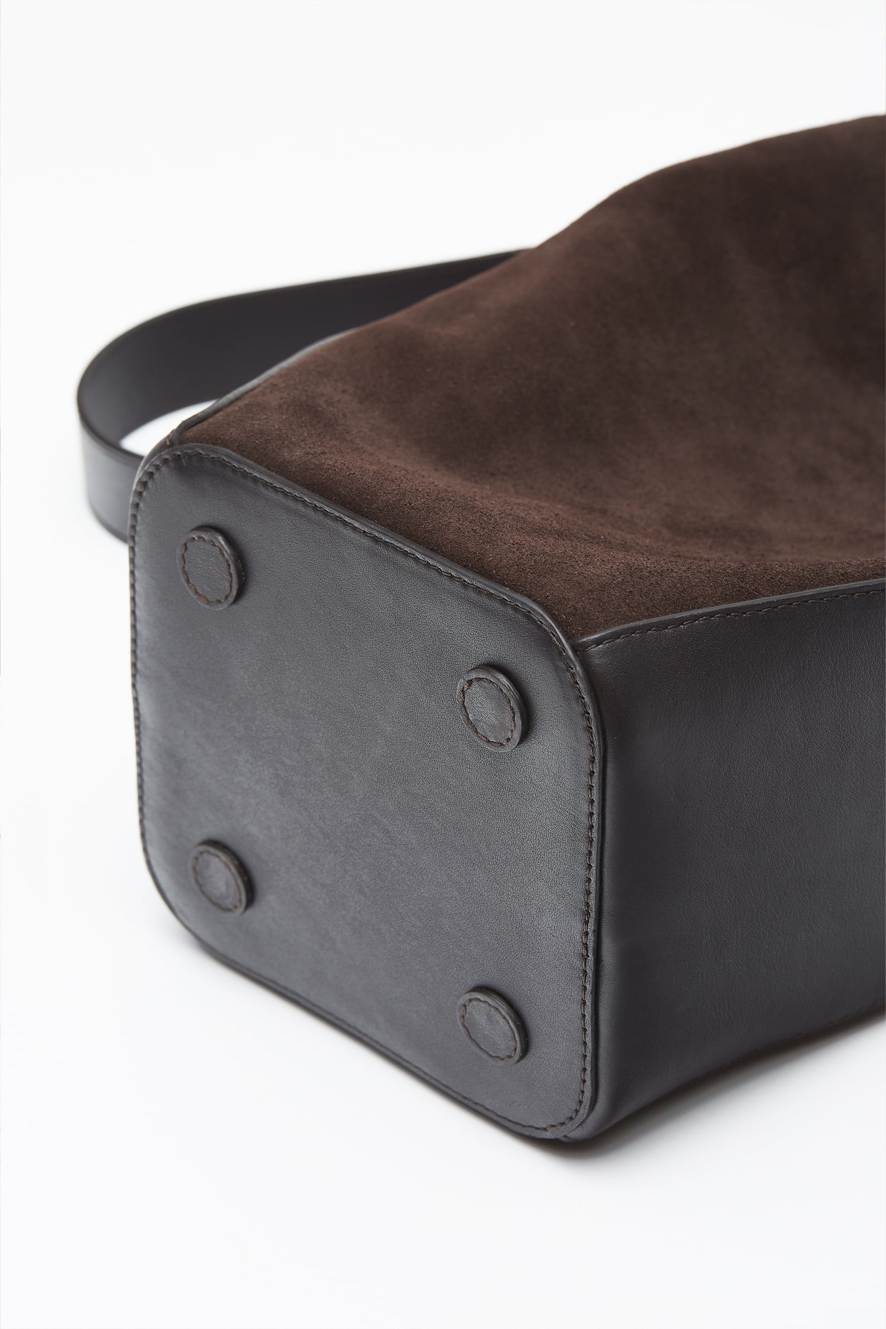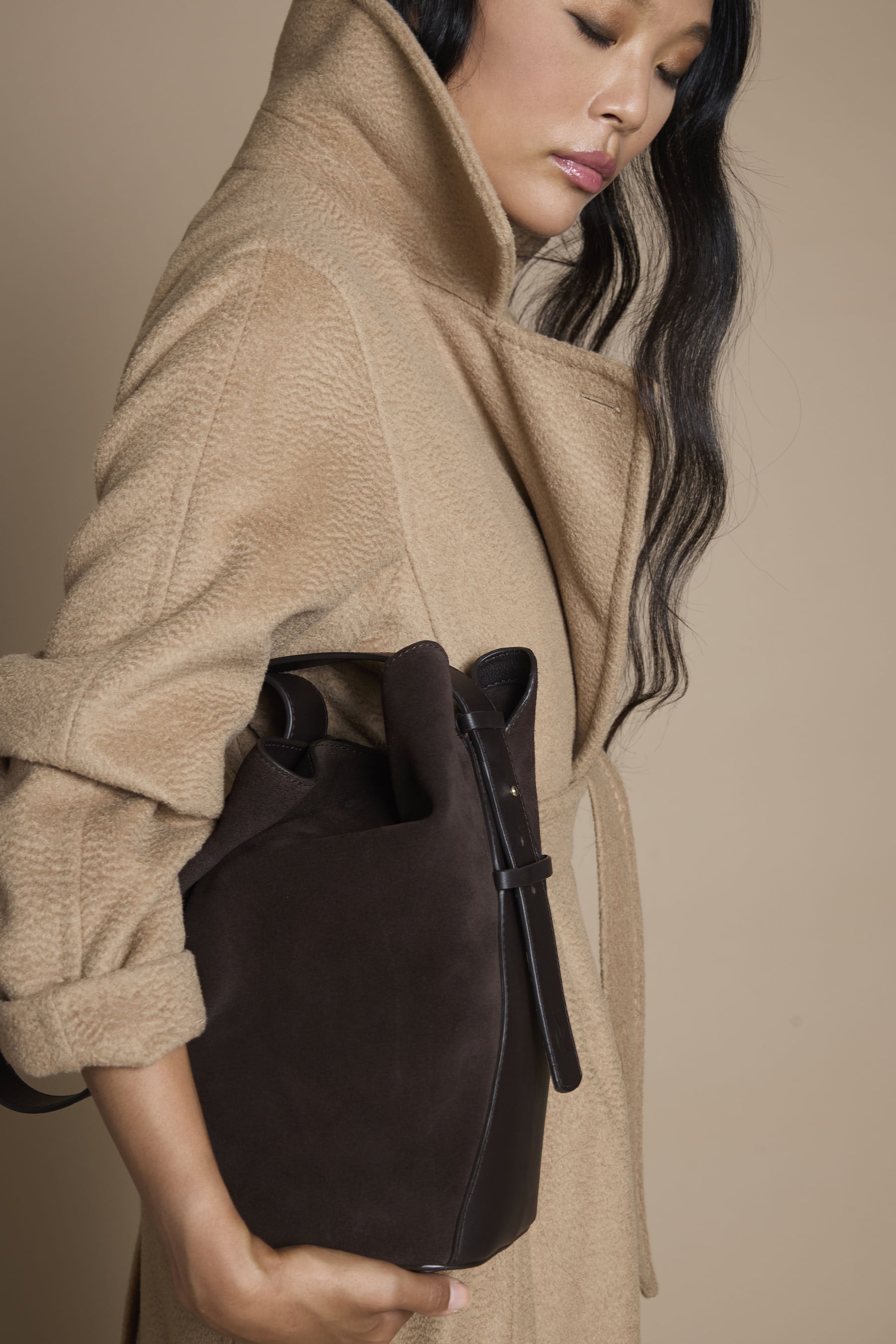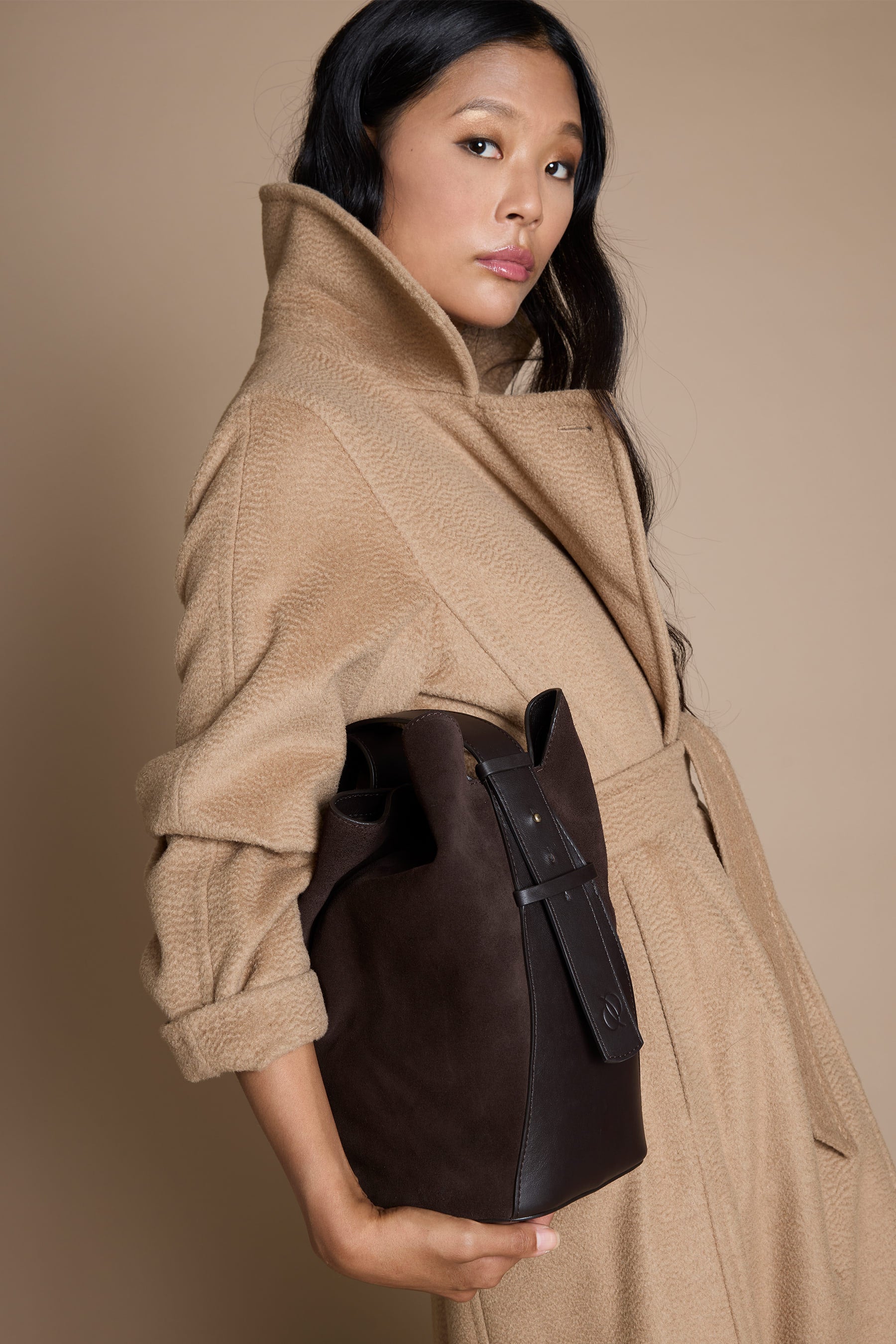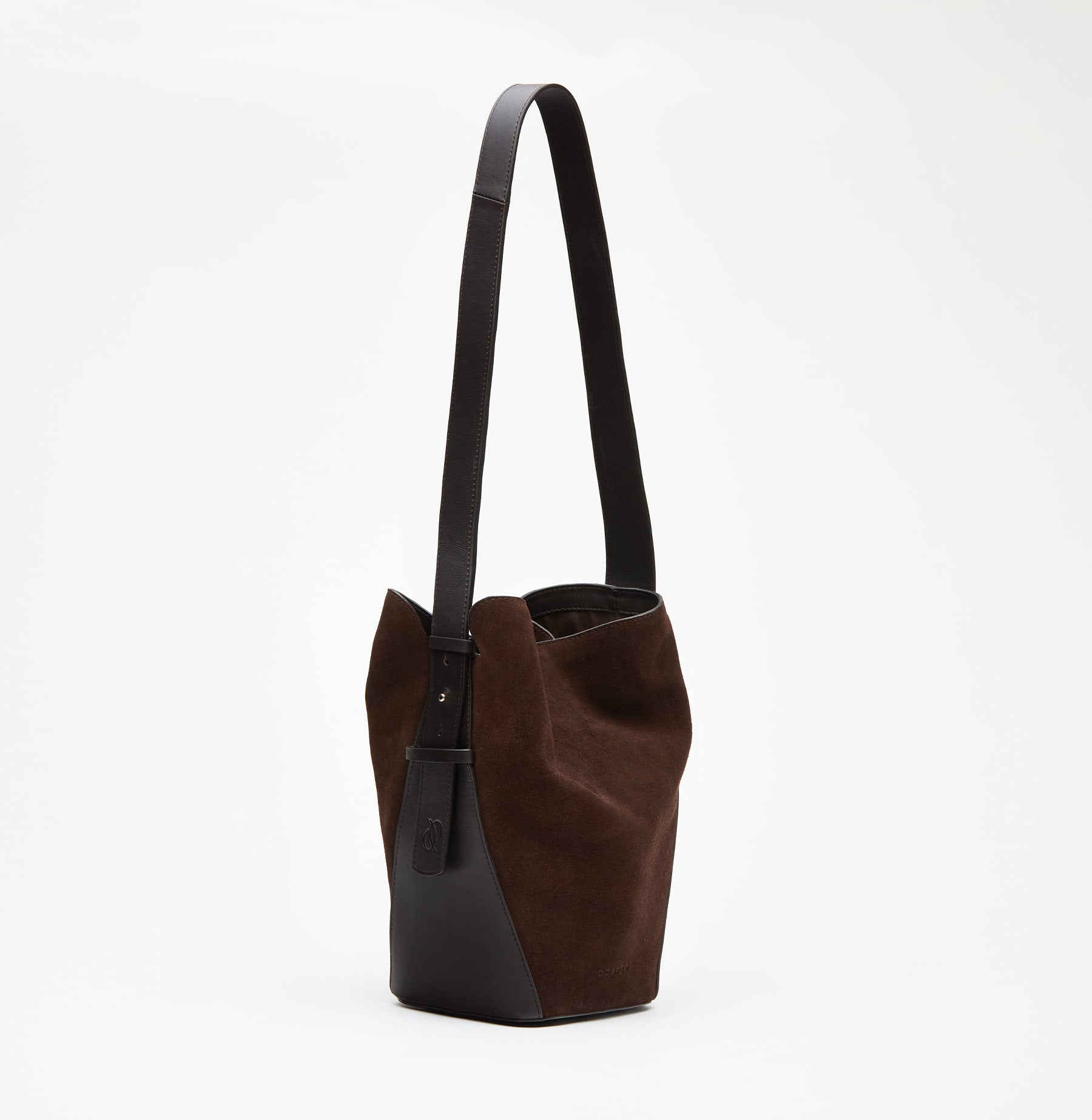 Bolso bucket minimalista, su construcción es sencilla y elegante de proporciones medianas, con una única correa graduable de asa superior en napa combinando serraje en los paneles lleva doble cierre interior, ideal para el lujo relajado.